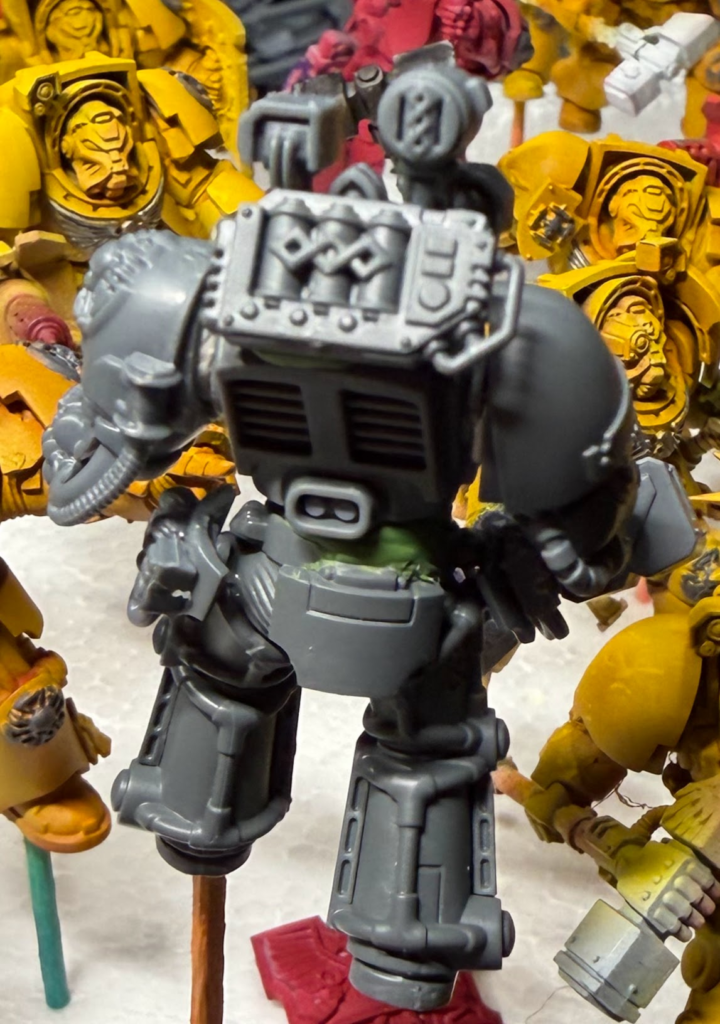 You can see the green stuff in this picture, to fill in where the Terminator’s armor isn’t big enough. If I lowered it to fit, the body dimensions looked wrong. I also added the Dark Angels bike Apothecary kit to the back of the Terminator to add a bit more detail.